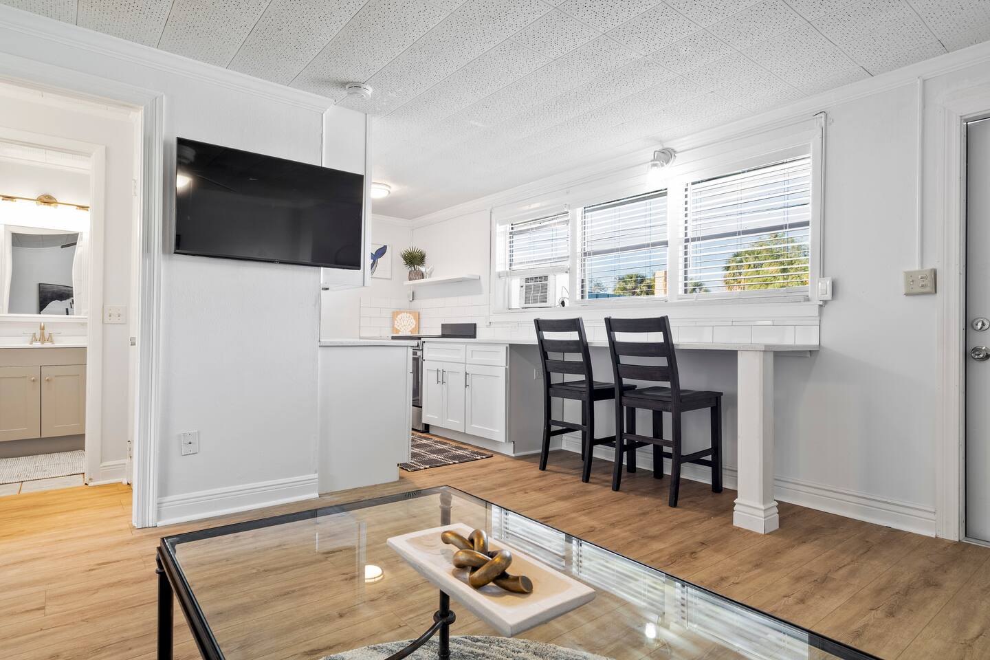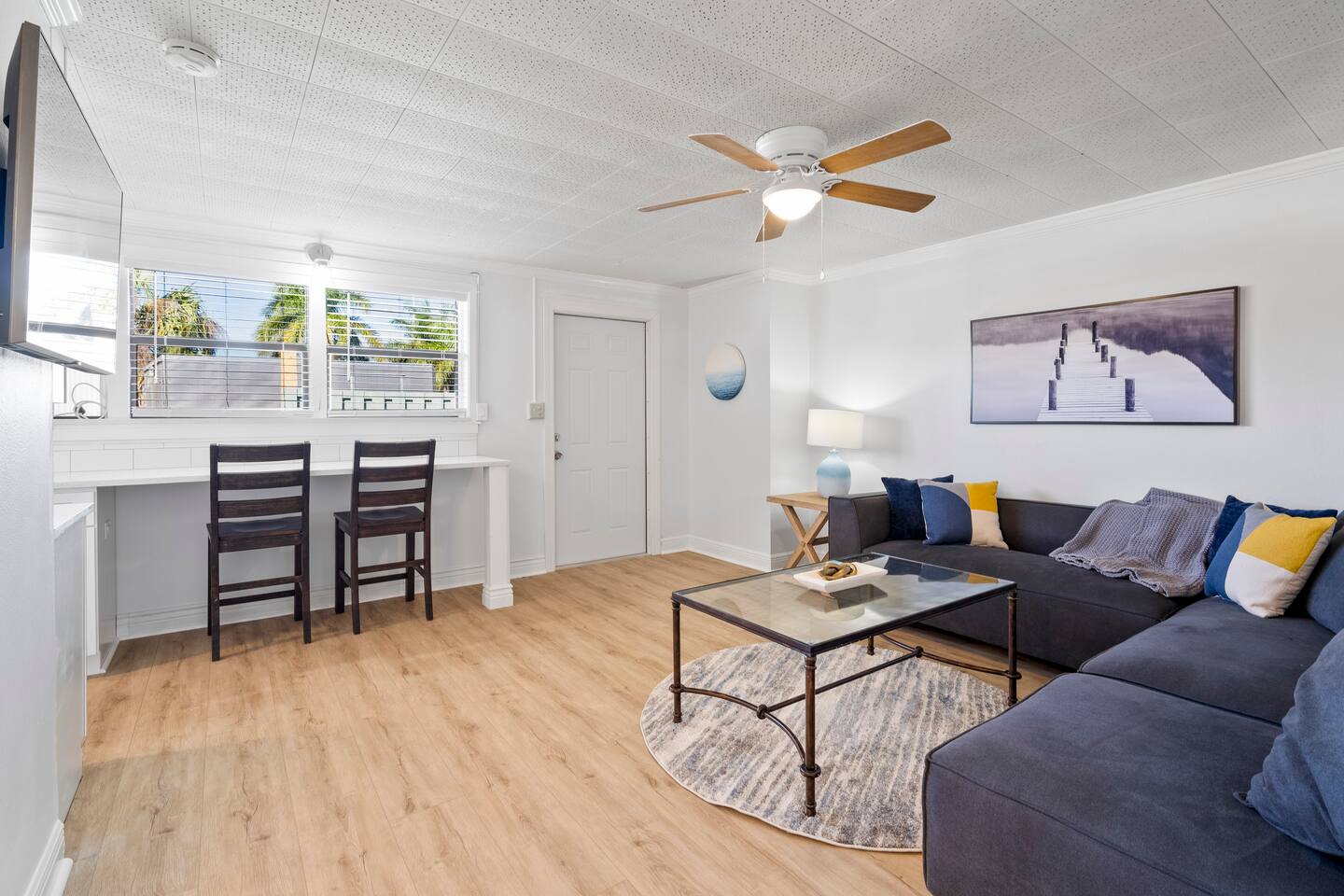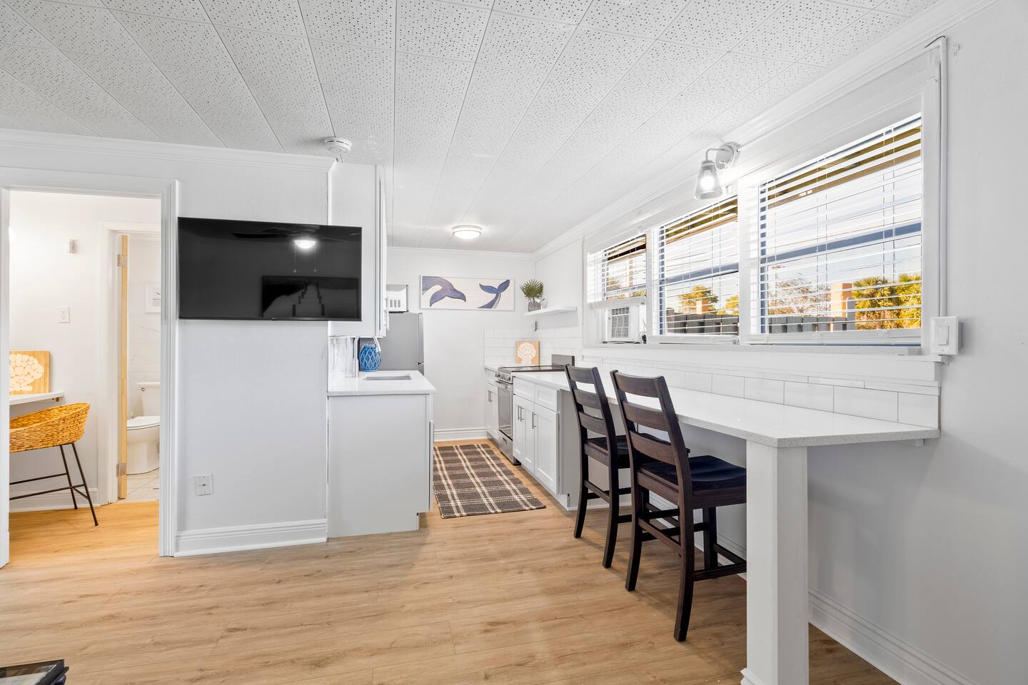 Enjoy a stylish experience at this centrally-located well appointed space in Jensen Beach. Explore the best of the Treasure Coast in our newly renovated apartment. Sunny living room / kitchen, quartz counters with stainless steal appliances. king size bed, large walk in shower, dedicated working space.